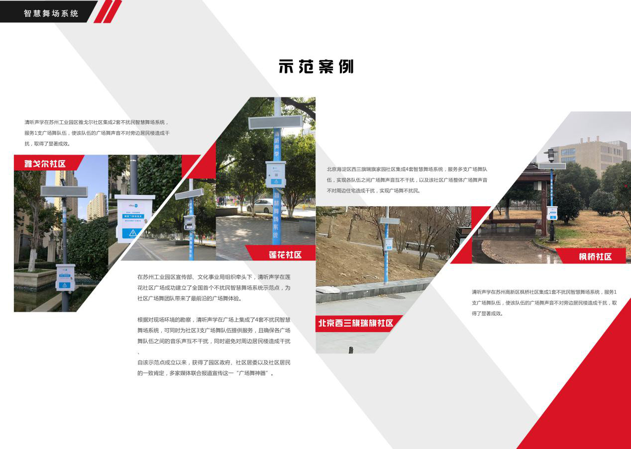 栗振介紹,智慧舞場系統(tǒng)的誕生是清聽聲學(xué)和中科院聲學(xué)所傾力合作的產(chǎn)物,是中科院聲學(xué)所蘇州電聲產(chǎn)業(yè)化基地首批重點孵化項目。清聽聲學(xué)作為蘇州本土企業(yè),依托中科院聲學(xué)所強大的科研實力,對高端定向聲技術(shù)進(jìn)行深入的系統(tǒng)研發(fā),先后獲得20多項核心專利、獲評“國家高新技術(shù)企業(yè)”、江蘇省“雙創(chuàng)人才”、“姑蘇人才”、江蘇省創(chuàng)新創(chuàng)業(yè)大賽二等獎、第11屆北京發(fā)明創(chuàng)新大賽金獎等多項榮譽稱號。清聽聲學(xué)創(chuàng)造性的將定向聲技術(shù)應(yīng)用到廣場舞領(lǐng)域,一舉實現(xiàn)了廣場舞不擾民,除了蓮花社區(qū)的首個示范點,目前也相繼在新區(qū)楓橋、園區(qū)雅戈爾社區(qū)等地方完成了試點體驗工作,收獲了社區(qū)基層居民的廣泛認(rèn)可。